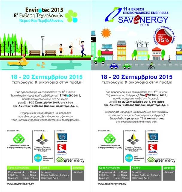 With great pleasure we invite you to the 11th Energy Saving Exhibition “SAVENERGY 2015” and 8th Exhibition of Environmental & Water Technologies “Envirotec 2015” which are organized by Cyprus Employers & Industrialists Federation (OEB) and will take place at the Cyprus International Fair Grounds (EXPO) in Nicosia between the 18th and the 20st of September 2015.